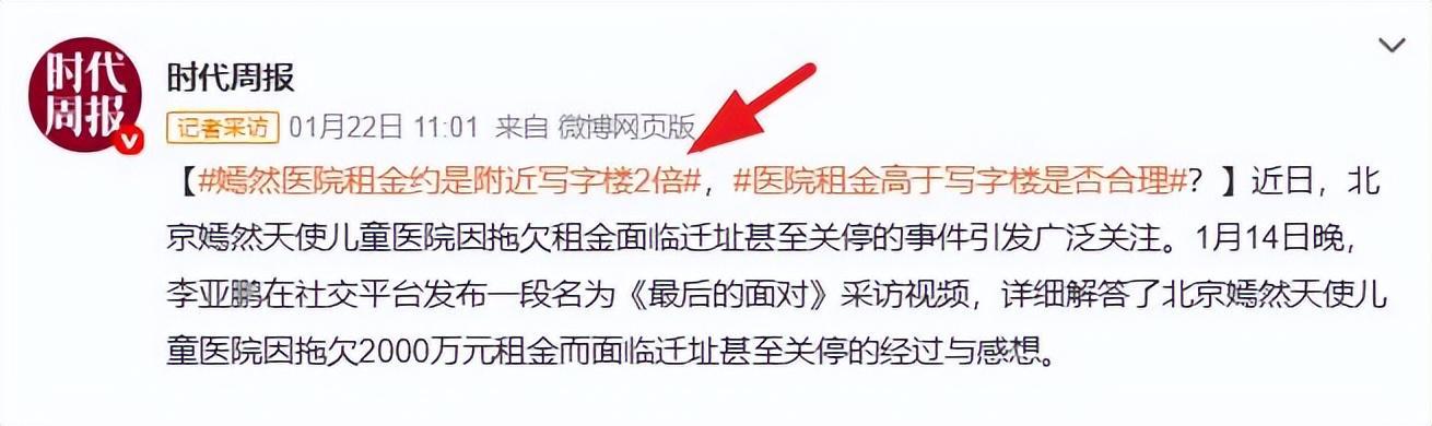 关于原来房东这边,据时代周报了解的最新消息。嫣然医院的租金约是附近写字楼的2倍,存在一个医院租金高于写字楼是否合理的问题。